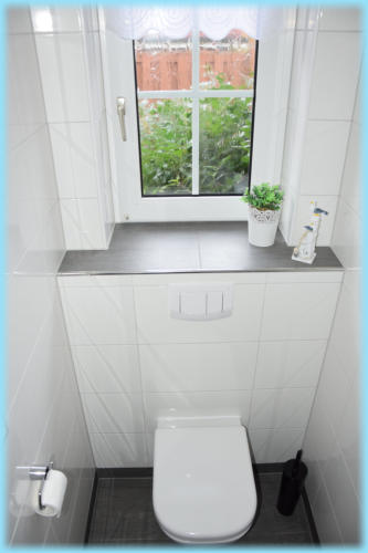 Bad mit Dusche, WC und Fenster. Bei kühlerer Jahreszeit kann